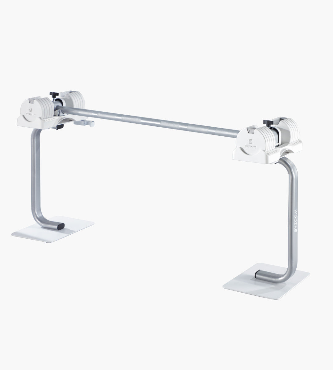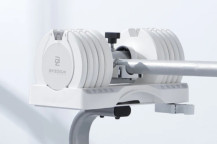 After pressing down to latch, tighten the knob to ensure that the dumbbell is firmly locked on the bar before picking it up.